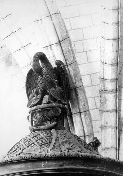 La rampe et la cuve sont décorés de panneaux moulurés. Le panneau central de la cuve est sculpté de trophées ecclésiastiques.