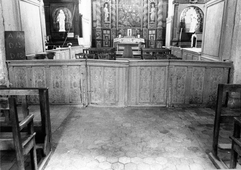 Clôture basse du choeur comportant onze panneaux sculptés et stalles.