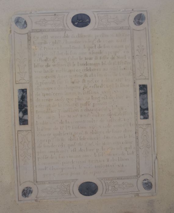 Inscription : commémorative des fondations faites par le chanoine Etienne Bourdier, mort le 2 mars 1631.