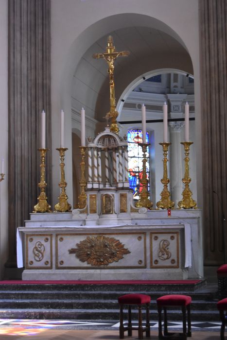 La porte du tabernacle est ornée d'un bas-relief représentant la Descente de croix. Deux autres bas-reliefs se retrouvent sur le soubassement saint Félix de Valois et saint Jean de Matha. Le soubassement supporte un hémicycle de huit colonnes avec demi-coupole, le tout en marbre de diverses couleurs et en bronze doré.