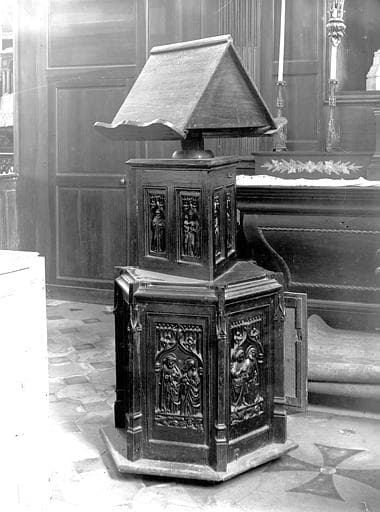 Ce lutrin se compose de trois parties, le soubassement hexagonal, le support triangulaire du pupitre et le pupitre à deux pentes.