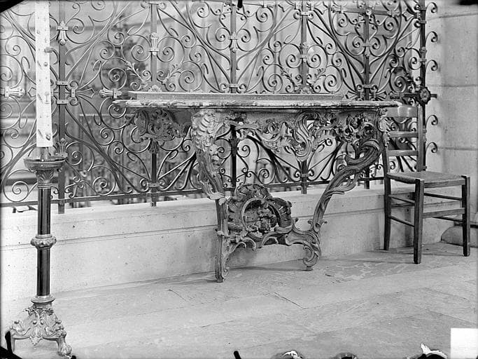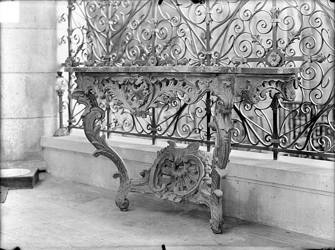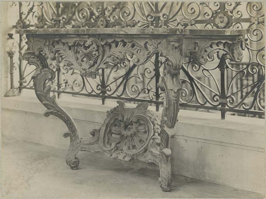 Consoles recouvertes l'une d'un plateau de brèche violette, l'autre d'un plateau de bois peint.