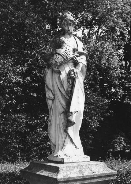 Statue sur un socle dans lequel a été incrusté un médaillon de femme.
