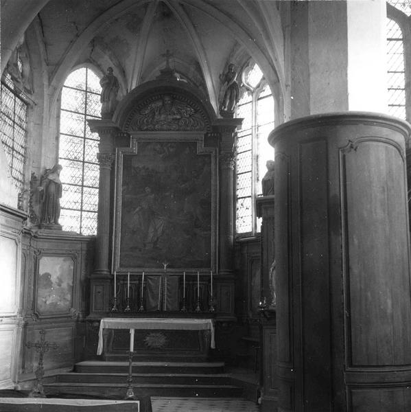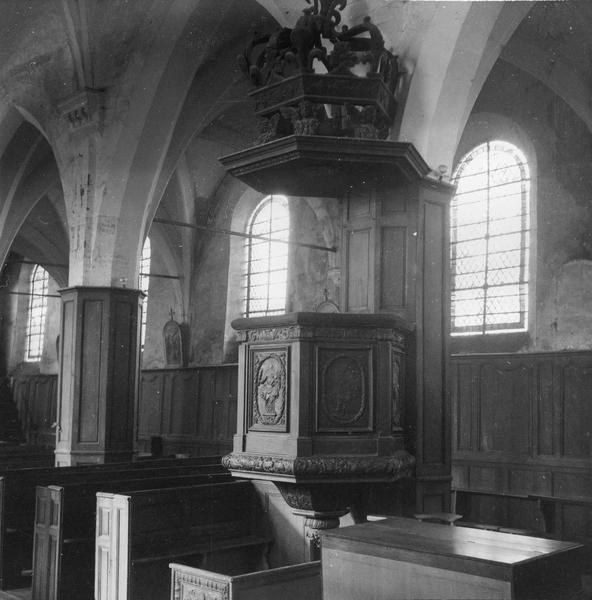 retable du maître-autel, chaire à prêcher, bancs de fidèles, lambris de revêtement, banc d'oeuvre