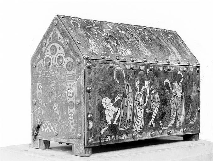La face antérieure est ornée de personnages émaillés, têtes gravées et niellées d'émail rouge, sur fond gravé de rinceaux. Sur la face postérieure sont des plaques de cuivre dorées, ornées de rosaces se détachant sur un fond bleu lapis.