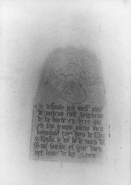 Transcription : Cy dessous git messire Philippe de Melun chevalier seigneur de la Borde en Brie qui en son temps a servi bien loyalement trois roys de France et trépassa le 7e jour de mars l'an M IIII soixante et seize Dieu ayt l'âme de lui Amen.