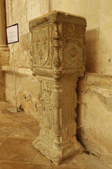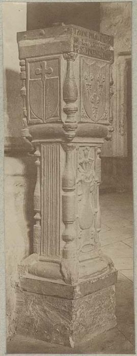 C'est une colonne à section rectangulaire dont les arêtes sont ornées d'imitations de tournage de formes différentes.