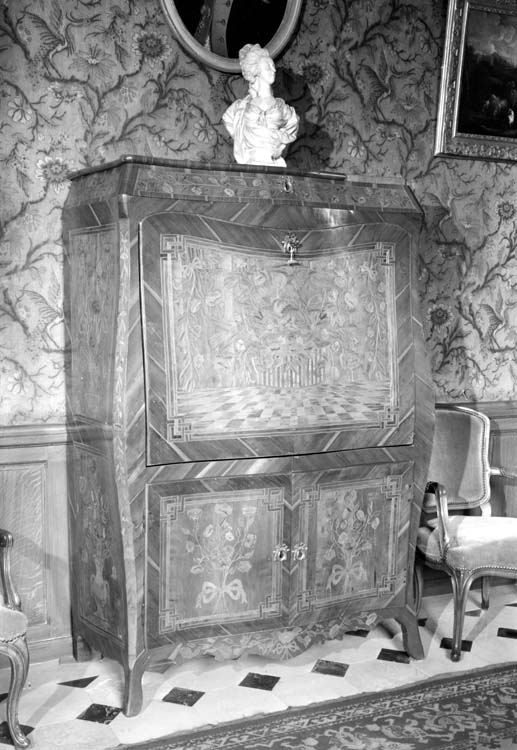 Grand secrétaire, Louis XVI, marqueté de fleurs, à deux portes au-dessous de l'abbatant et un tiroir au-dessus.