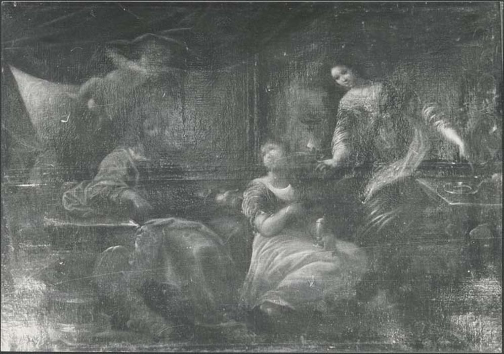 Les trois personnages principaux composent le noyau de la toile, tandis qu'un putti retient le lourd rideau de scène. La perspective floue de l'espace, les contours peu définis du mobilier n'empêchent pas la scène de tenir. Traitement intimiste de l'épisode évangélique. Brio dans le traitement des étoffes.