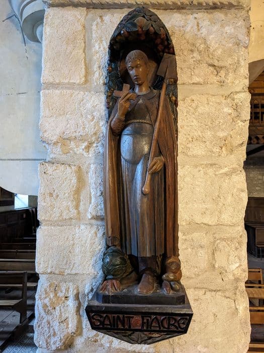 D'après la légende, saint Fiacre aurait vécu en ermite après avoir refusé la couronne d'Ecosse. Saint Faron lui accorda par la suite une terre près de Meaux afin d'y fonder un monastère : il lui sera donné autant de terrain qu'il lui sera possible d'en entourer d'un fossé en une journée. Après avoir tracé les limites avec son bâton, le fossé se serait miraculeusement creusé. Le saint, qui nourrira les pèlerins des produits de son jardin, est devenu patron des jardiniers. Il est représenté ici en ermite, sur un socle orné de fleurs et sous un dais de verdue et de fruits. Il porte une pelle sur l'épaule gauche et une croix dans la main droite. A ses pieds sont représentés de nombreux légumes : poireaux, carottes, choux, petits pois, pommes de terre, feuilles de vigne, potiron.