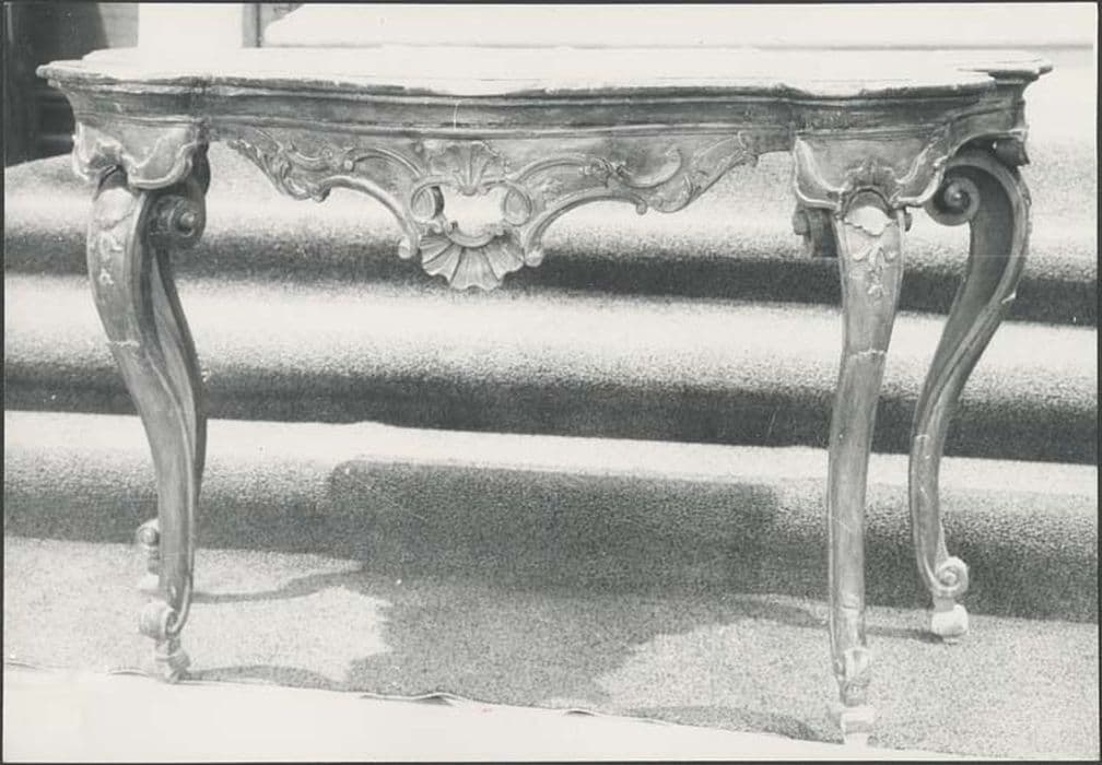 Console à quatre pieds, ornée de volutes et coquilles, dans le style rocaille propre au 18e siècle.