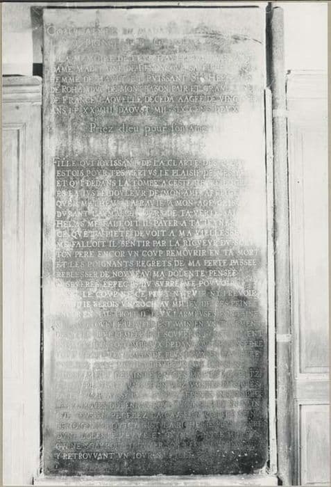 Marbre noir gravé avec long épitaphe funéraire de Madeleine de Lénoncourt, femme d'Hercule de Rohan morte le 28 août 1602, par sa mère Françoise de Laval.