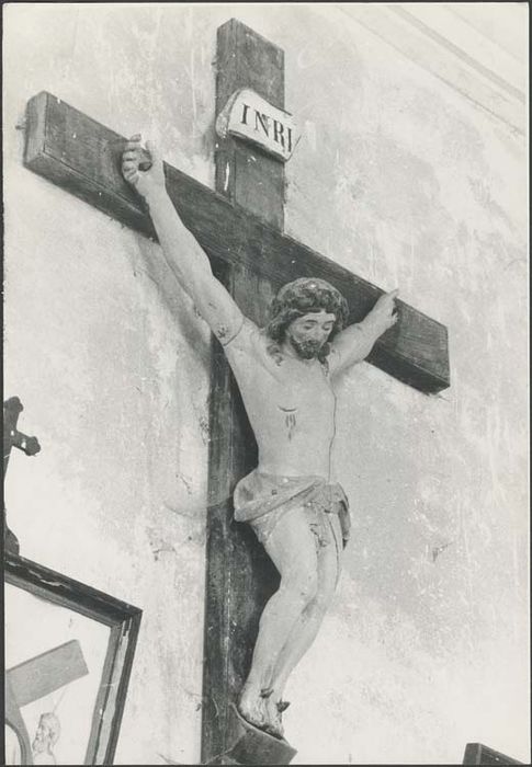Croix en bois sur laquelle est clouée une représentation du Christ en trois parties (partie centrale et les deux bras). Une fêlure marque le coté droit de la partie centrale. La croix n'est pas en bois plein mais semble formée d'un assemblage de planches.