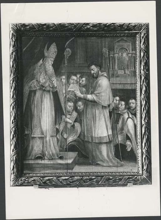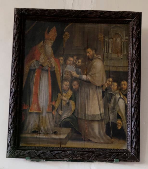 Panneau rectangulaire, vertical. Cadre en forme de guirlande de laurier similaire à celui de "La naissance de la Vierge", devant l'autel de la chapelle de la Vierge (PM77000089).