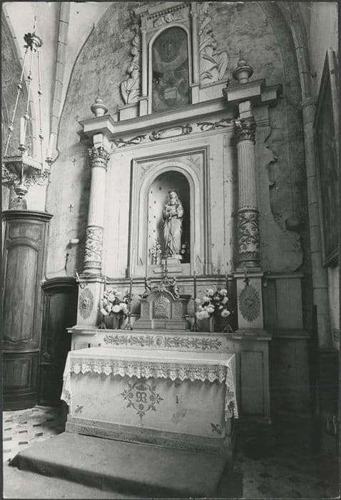 Colonnes corinthiennes à la partie inférieure ornée de rinceaux, des pots à feu les surmontent. De part et d'autre se trouvent des ailerons à volutes (tronqués). Une niche au décor d'étoiles peintes accueille une statue de Vierge à l'Enfant. L'autel est à bords droits. Un haut fronton architecturé accueille un tableau de l'Assomption, deux anges agenouillés y sont adossés. Tabernacle à fronton cintré, la partie supérieure de la porte suit la courbe du fronton. un socle achève l'élévation.
