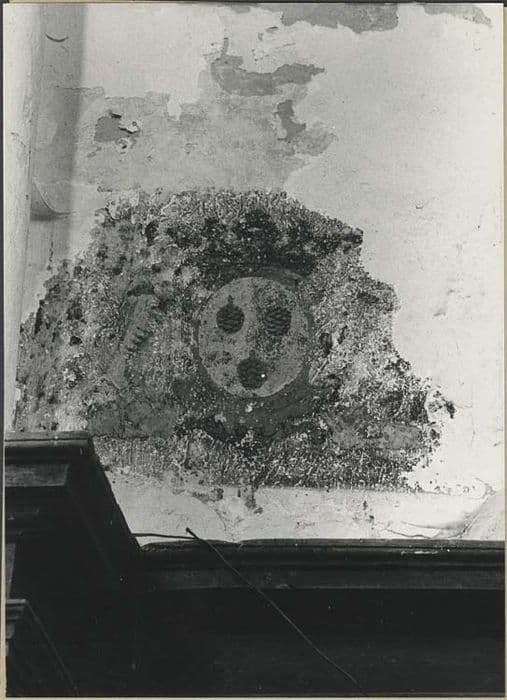Litre funéraire avec blason couronné à pommes de pin qui se retrouve à différents endroits de l'église.
