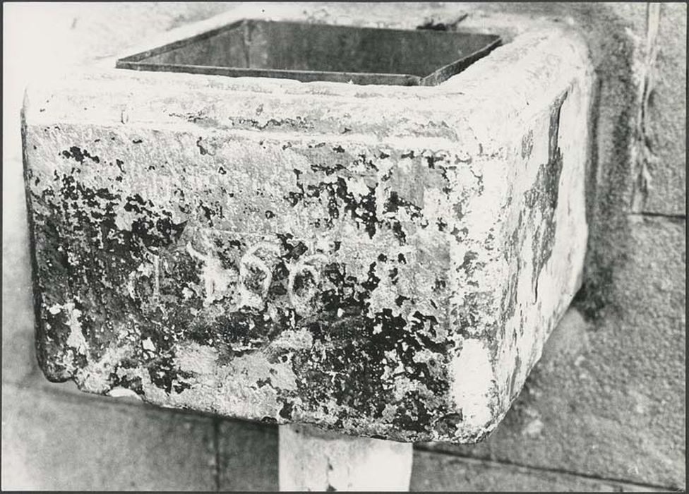 Bénitier de forme rectangulaire, encastré dans le mur.