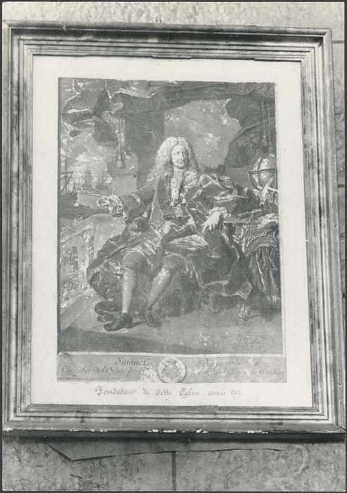 La gravure représente Samuel Bernard, banquier du roi, d'après un portrait célèbre. Mais la mention "Fondateur de l'église année 1748" correspond plus probablement à son fils, président au Parlement de Paris et Seigneur de Coubert et de Guignes.