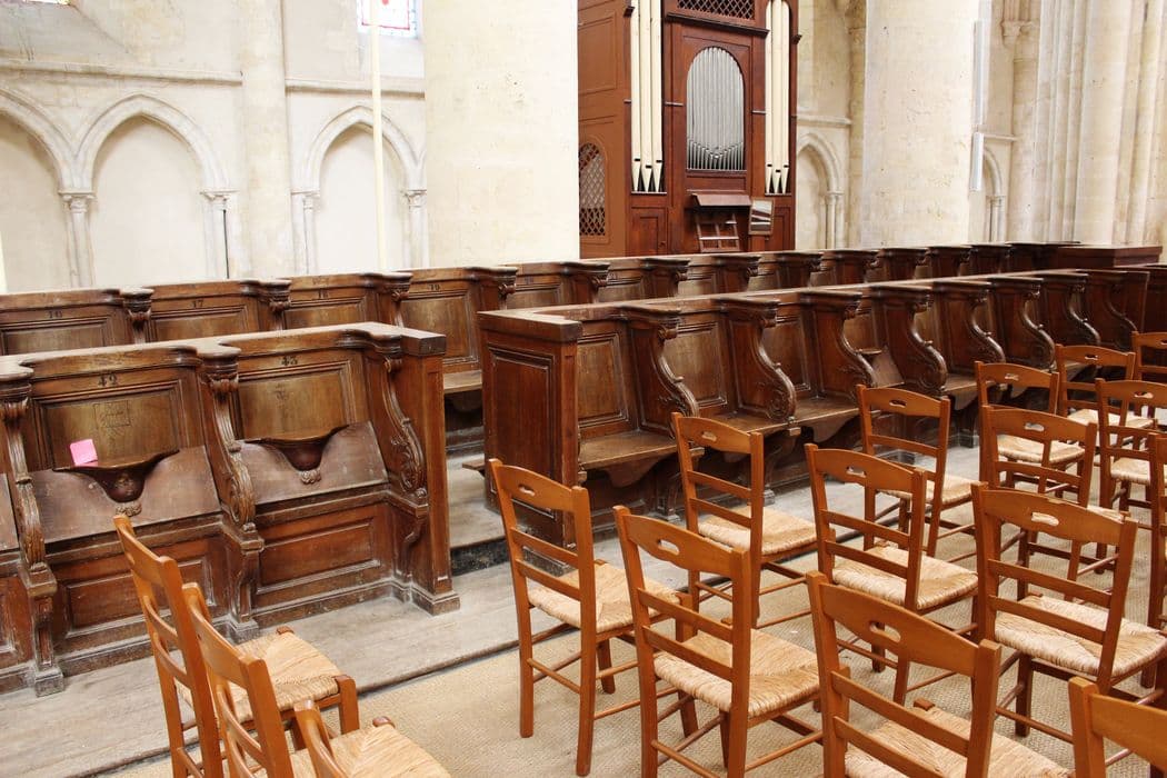 Ensemble de stalles à panneaux moulurés, les jouées sont ornées de volutes végétales.