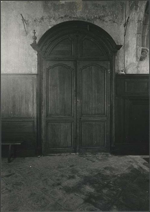 Porte du mur sud à deux battants et à panneaux moulurés, cintrée sur le dessus.