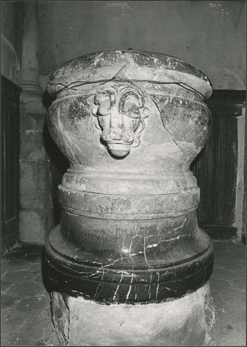 Fonts baptismaux de forme ovale avec une tête de bélier (?) à chaque extrémité.