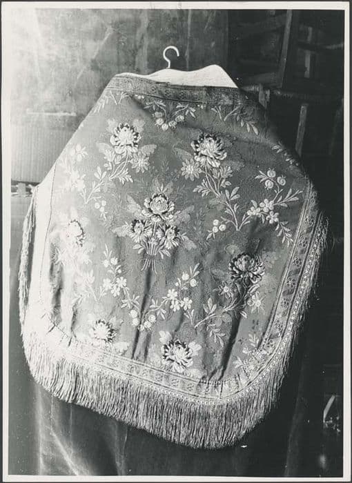 Chape à fond rouge, tissu broché de fleurs multicolores.