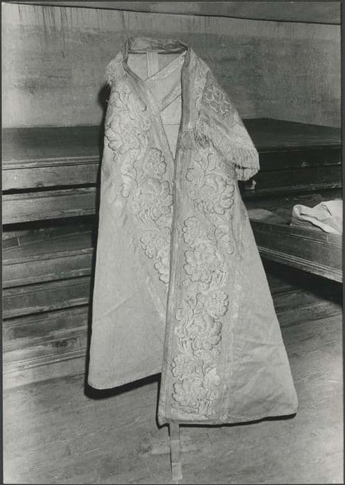 Chape en tissu à fond or rebrodé d'orfrois.