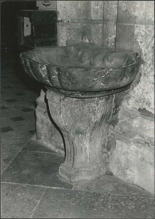 Les deux bénitiers sont semblables avec une vasque en forme de coquille, en marbre rouge et un pied nervuré en pierre.
