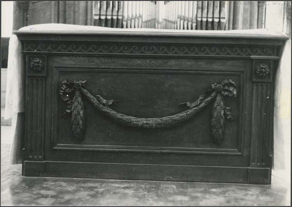 Réutilisé pour le devant de l'autel du choeur, l'ancien banc d'oeuvre est décoré d'une guirlande, d'une frise à rinceaux et de cannelures.
