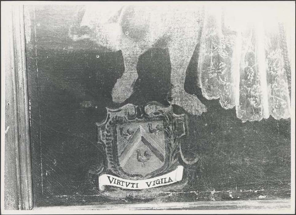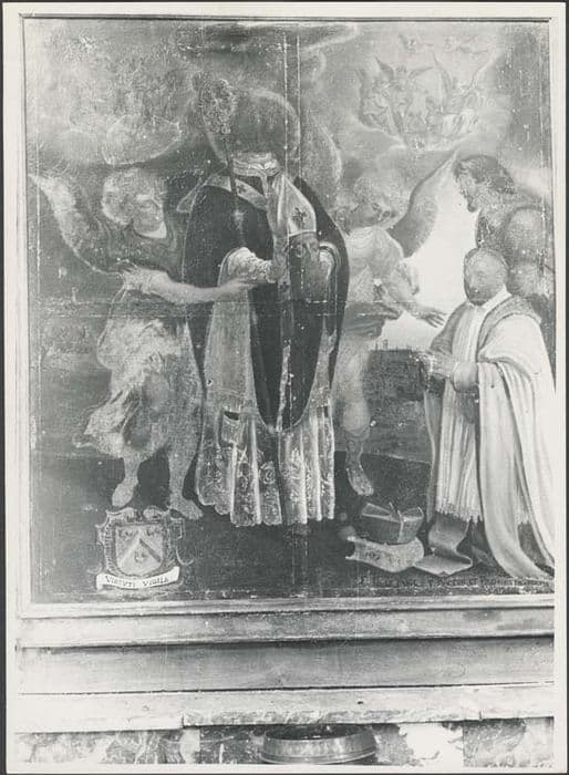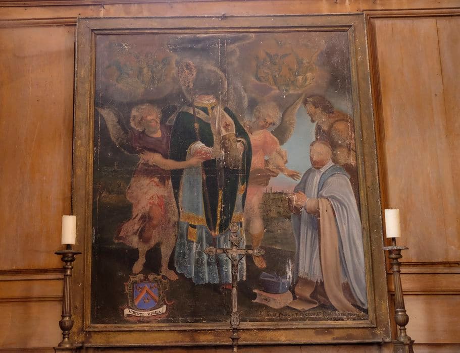 Tableau du retable latéral nord, avec donateur et armoiries.