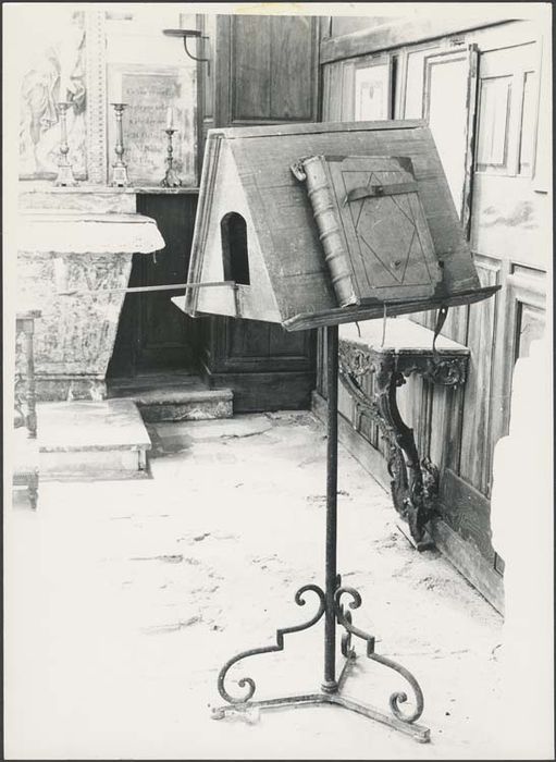 Lutrin à dos d'âne avec reposant sur un pied simple en fer forgé constitué d'une tige et se terminant par trois volutes.