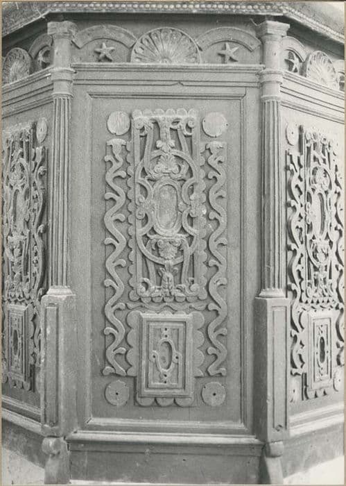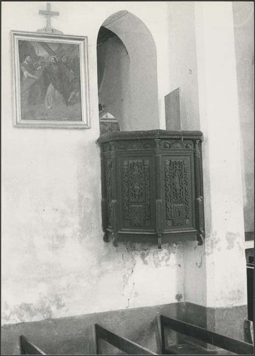 Chaire à prêcher composée de quatre panneaux chevillés et d'un escalier d'accès à travers le mur.
