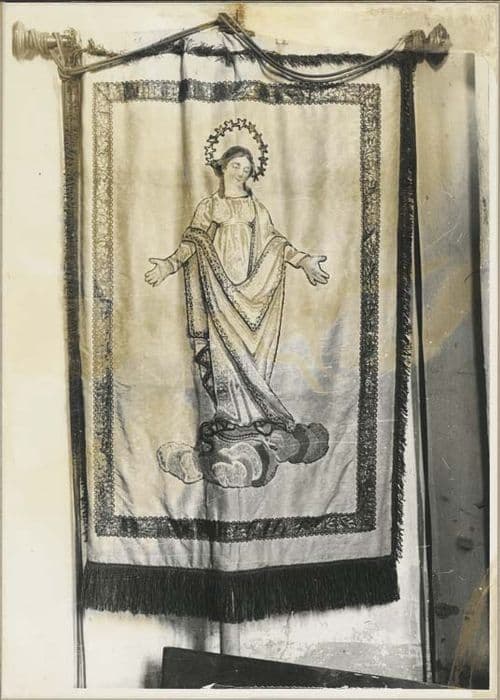 Bannière de procession avec la Vierge de l'Assomption brodée sur fond de soie blanche. Ses mains et son visage sont peints.