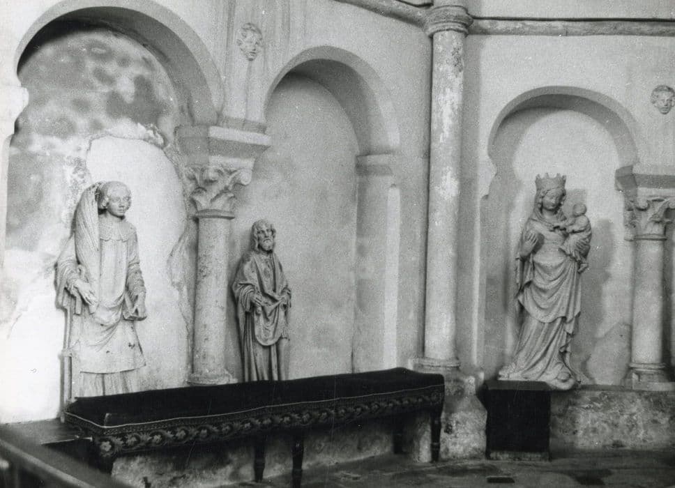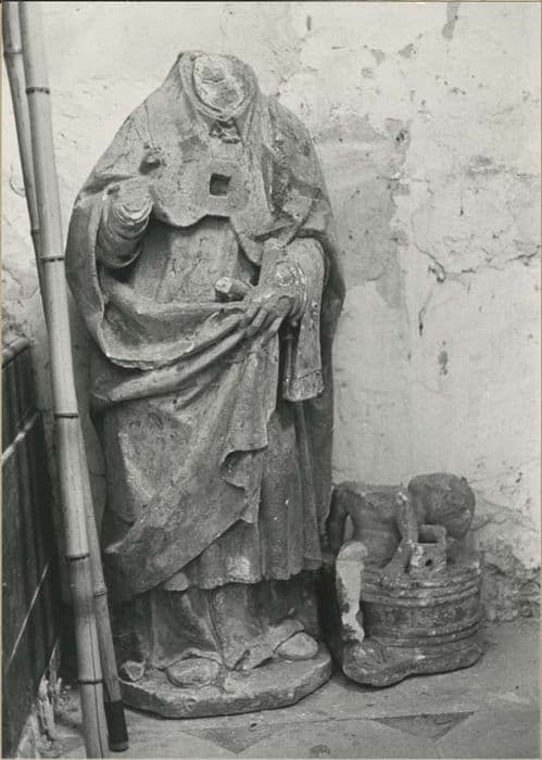 Statue mutilée, la tête est séparée du corps, un baquet posé à côté de la statue pourrait appartenir à celle-ci, mais il ne semble pas y avoir de point d'attache. Trace de polychromie sur le corps et sur la tête de l'évêque.