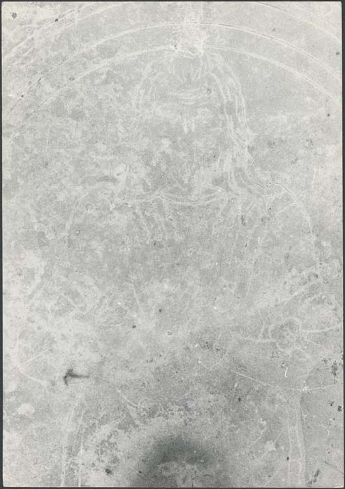 Dalle rectangulaire. L'inscription est tournée vers l'extérieur. Représentation du défunt en armure.