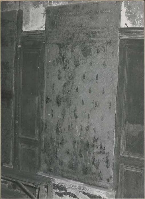 Pierre noire, le texte en latin est gravé dans la partie supérieure de la pierre, le reste de cette pierre est incrustée de larmes, courte inscription tout en bas (date ?).