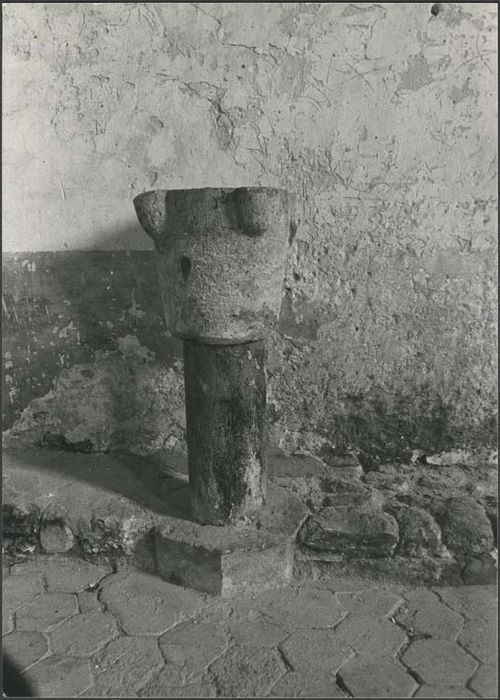 Mortier de réemploi posé sur un fût en pierre, lui-même fixé sur un socle octogonal. Celui-ci est actuellement noyé en partie dans le rebord de pierre et ciment qui finit le mur ouest.