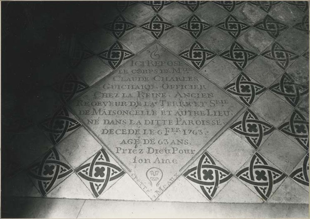 Epitaphe : ICI REPOSE - LE CORPS DE MTRE - CLAUDE CHARLES - GUICHARD OFFICIER - CHEZ LA REINE ANCIEN - RECEVEUR DE LA TERRE ET SRIE - DE MAISONCELLE ET AUTRE LIEU - NE DANS LA DITTE PAROISSE - DECEDE LE 6 FER 1763 - AGE DE 63 ANS - Priez Dieu Pour - son Ame ; inscription : Cretté à Meaux.