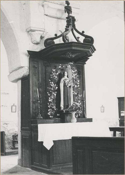 Banc d'oeuvre de style Louis XVI, transformé en autel. Le dais est surmonté de quatre volutes soutenant un pot à feu.