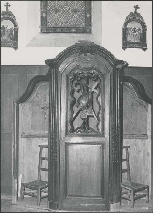 Confessionnal à ailes. Le fronton est cintré. Deux pilastres encadrent la porte. Le bord supérieur des ailes est ondulé.