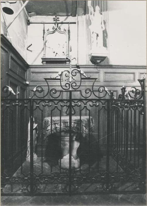 Grilles encadrant les fonts baptismaux sur deux côtés.