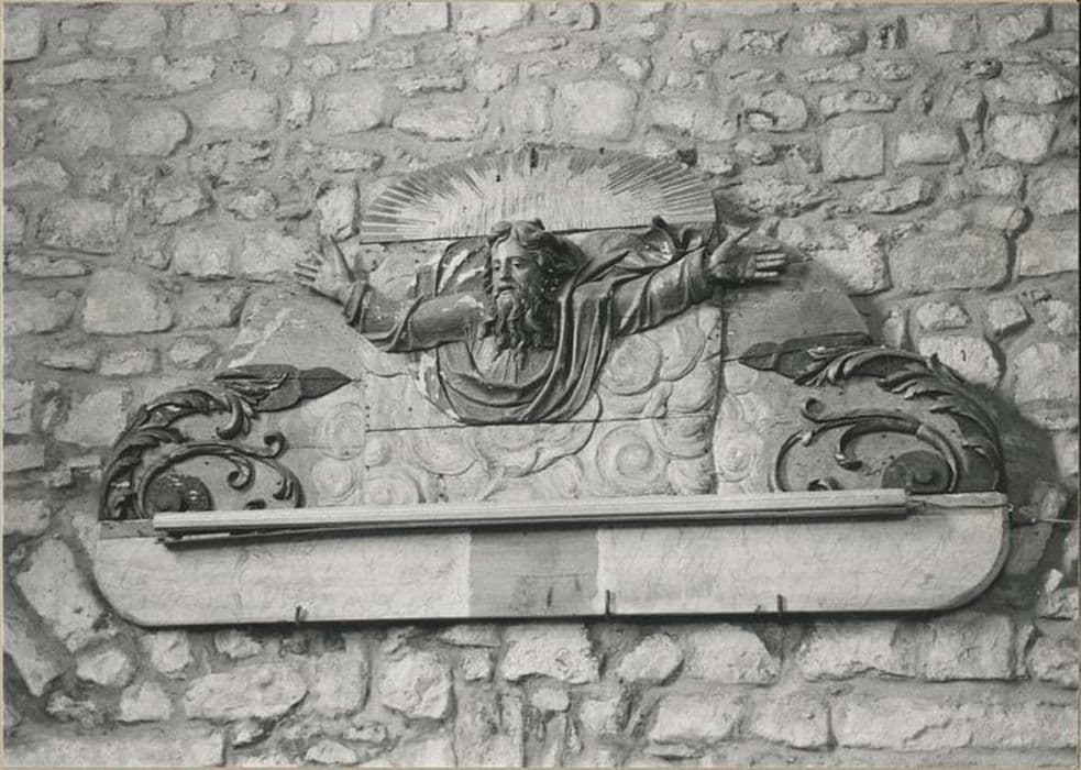 Ce fragment représente la tête barbue de Dieu le Père, les bras écartés, entouré d'une nuée et d'un rinceau de part et d'autre.
