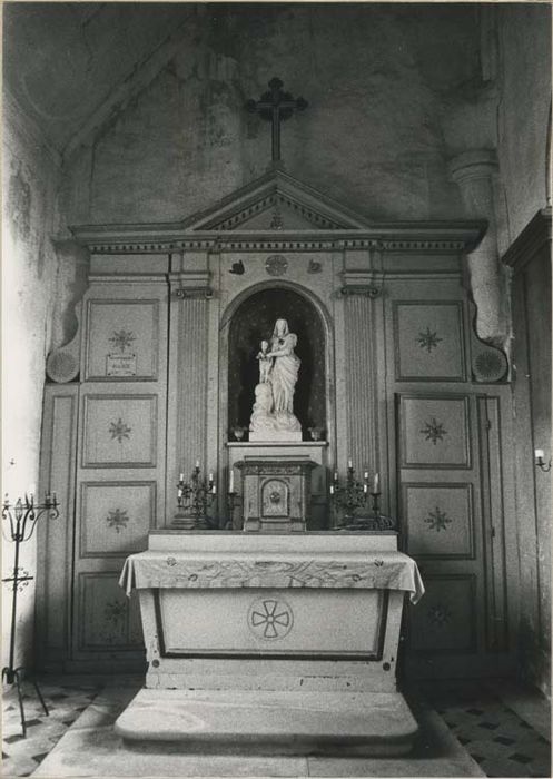 Autel de forme trapézoïdale décoré de simples moulures peintes sur sa face antérieure et d'une croix grecque inscrite dans un cercle. Son retable est architecturé avec au centre, une niche où prend place une statue.