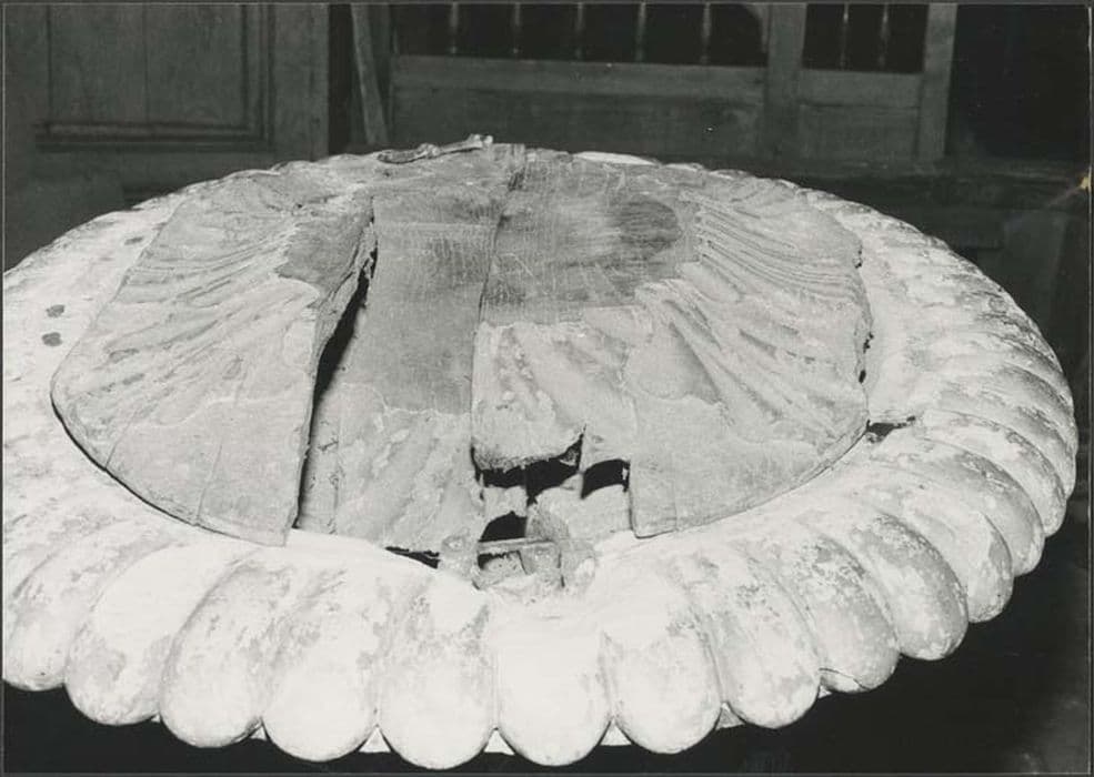 Le pied, le fût et la vasque sont en pierre. La vasque est ornée de godrons sur tout le rebord et elle est ornée d'une feuille d'acanthe dessous. La cuve est fermée par un couvercle en bois sculpté.