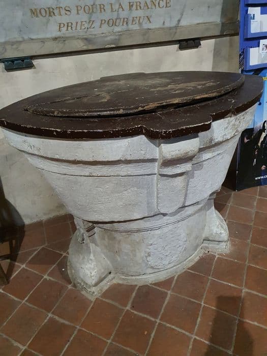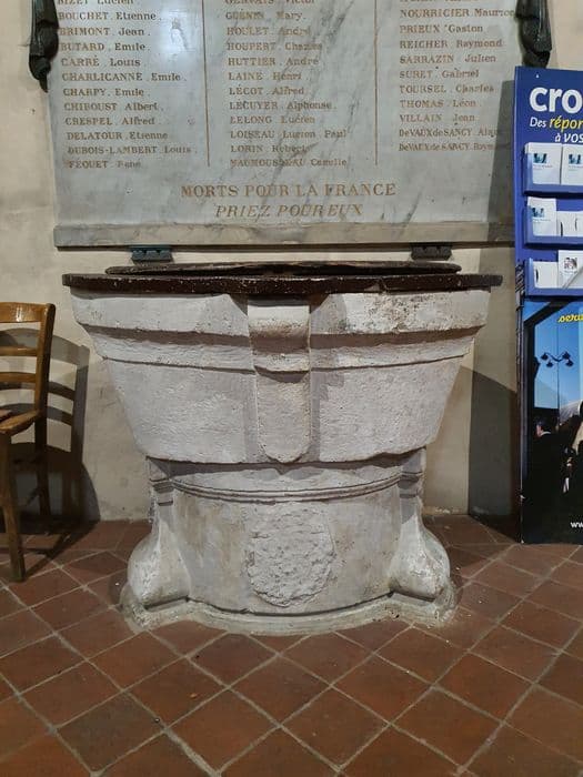 Fonts baptismaux en pierre en forme de navette, armoiries mutilées sur le pied. Rebord des fonts et couvercle en bois.