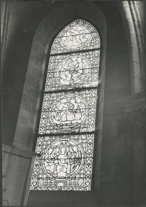 Baies à une seule lancette. Les vitraux de l'absidiole nord comprennent trois registres, ceux du sud, quatre registres