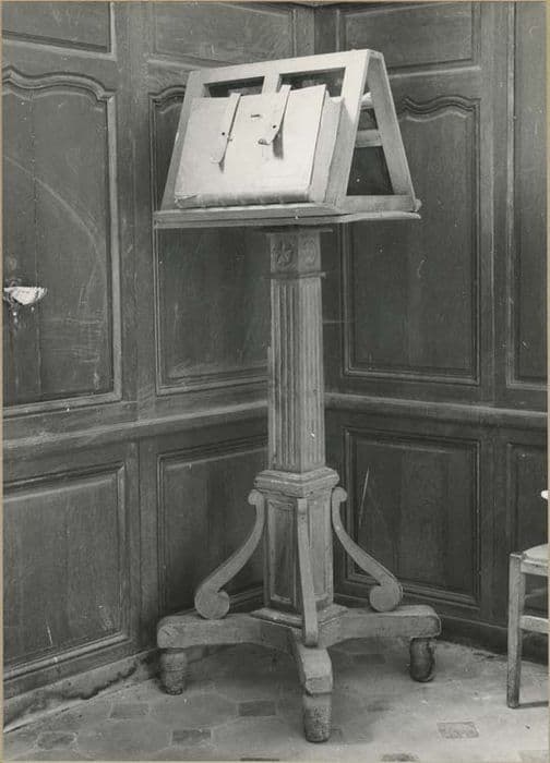 Lutrin à dos d'âne et fut cannelé. Quatre volutes ornent la base du pied. Des étoiles inscrites dans un cercle décorent le haut du fût sur chaque face.