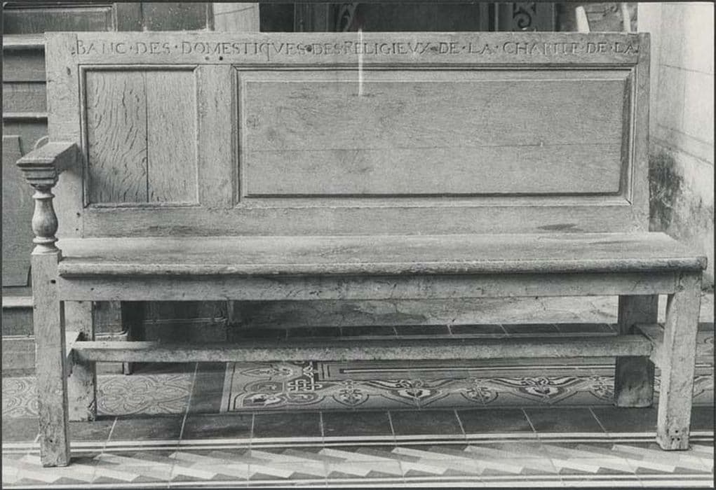 Ensemble de bancs avec accoudoirs sculptés. Un des bancs porte une inscription.