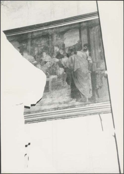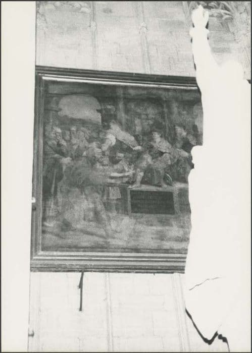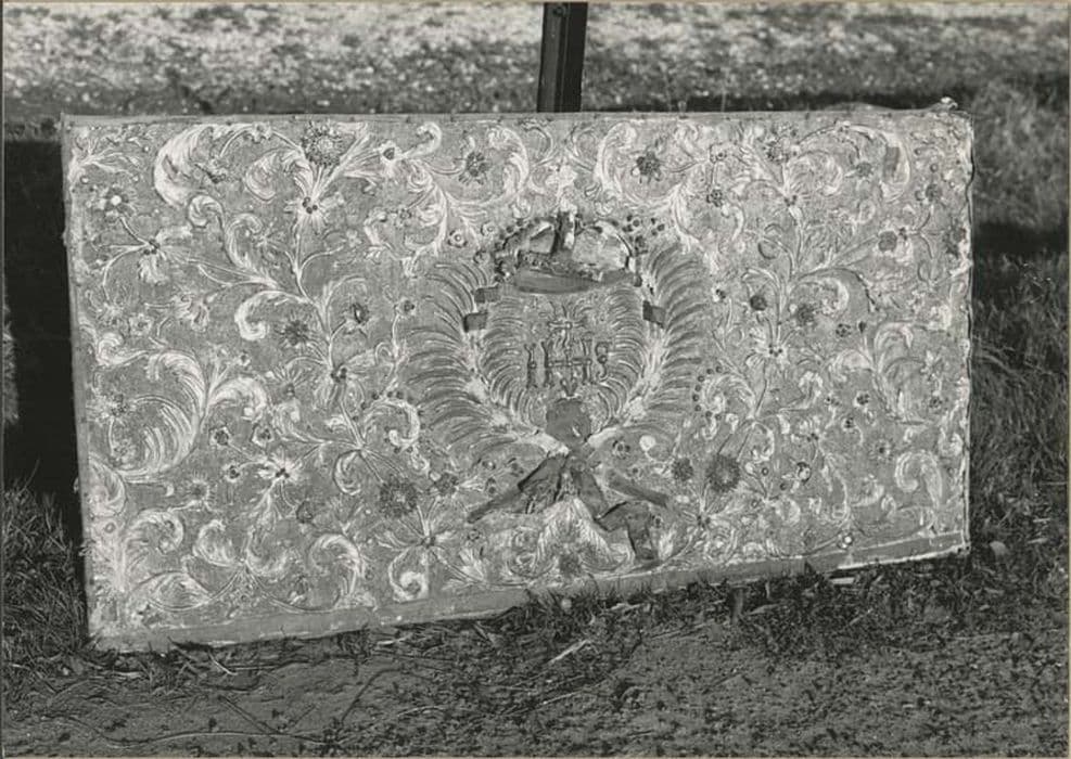Antependium orné de feuillage, volutes, fleurs et inscription, en plâtre peint, le tout sur toile.
