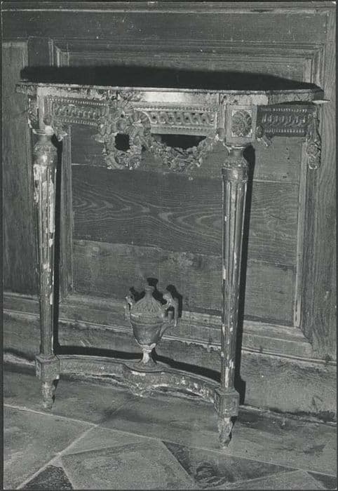 Console de style Louis XVI, ornée d'une guirlande de fleurs sous le dessus de marbre, et d'un pot en dessous de la guirlande.